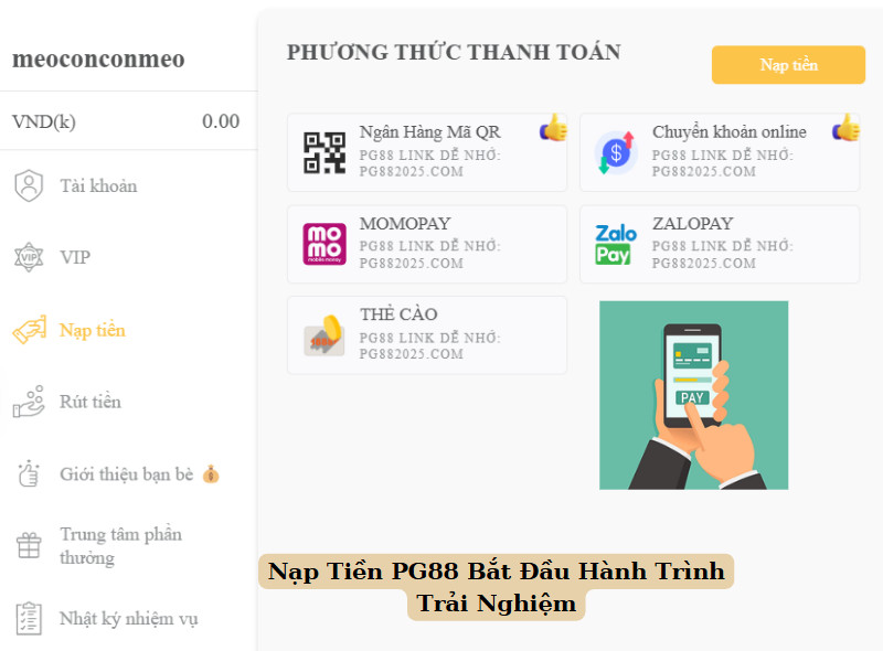 - Đăng nhập tài khoản PG88 của mình, chọn mục Nạp tiền